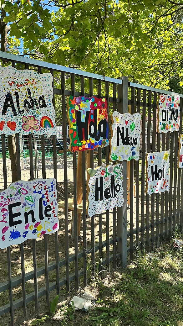 In der letzten Schulwoche haben alle Schülerinnen und Schüler an einer Kunstaktion teilgenommen. Diese hat Michael Guinand vorbereitet und angeleitet. Ziel war es Schilder mit der Aufschrift "Hallo" in verschiedenen Sprache zu gestalten. Die Schilder sehen super aus und hängen nun als Begrüßung an unserem Schulhof. Mit diesen Schildern wollen wir auch schon jetzt die Schülerinnen und Schüler des neuen 1. Jahrgangs begrüßen.